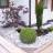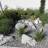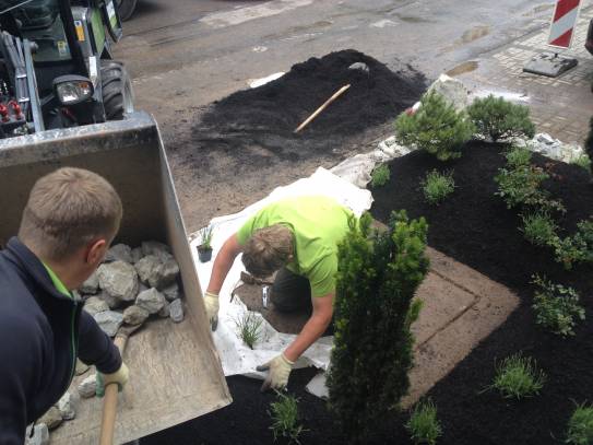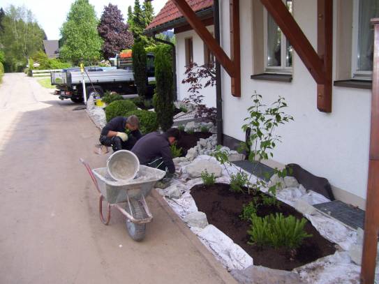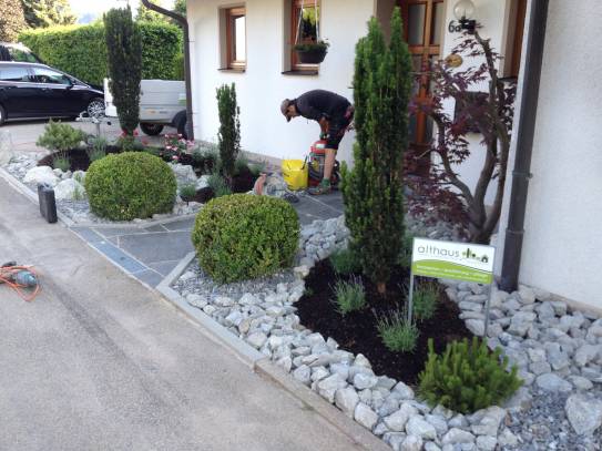 Heimischer Granit-Phonolith-Schotter unterschiedlichster Körnung auf unkrautfestem Trennvlies bilden den Felscharakter, die immergrünen Solitärs: Säuleneibe; Bergkiefer und Buchs begleiten die übers Jahr abwechselnd blühenden Sommerblühsträucher, Stauden, Gräser und Zierpflanzen.