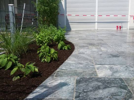 Die Pflanzflächen grenzen nicht wie üblich an die Beläge an, vielmehr sollte die Gesamtgartenfläche auch für Feste nutzbar sein, die Pflanzflächen wurden also aus der dann ebenen, allseitig eingefassten Belagsfläche „herausgeschnitten“.