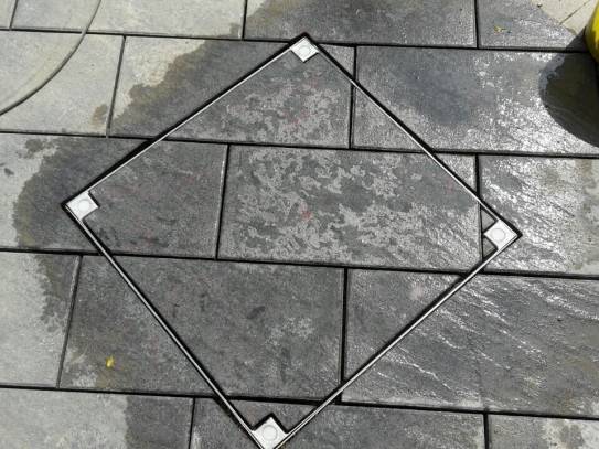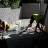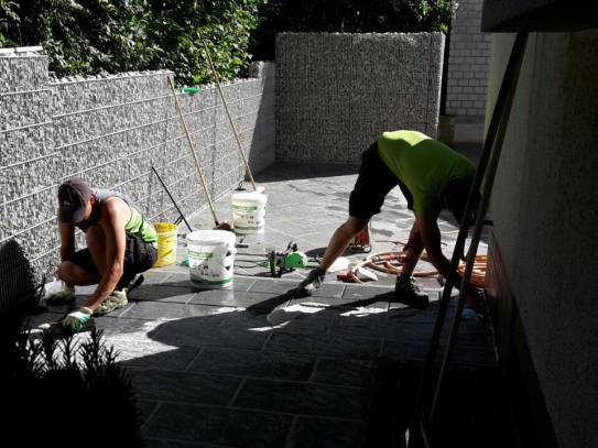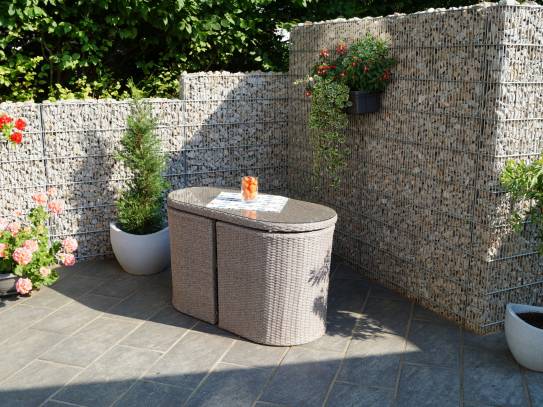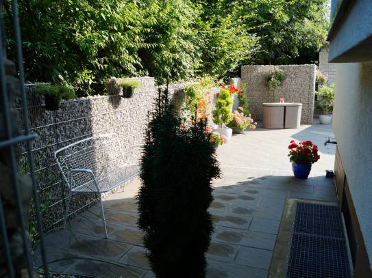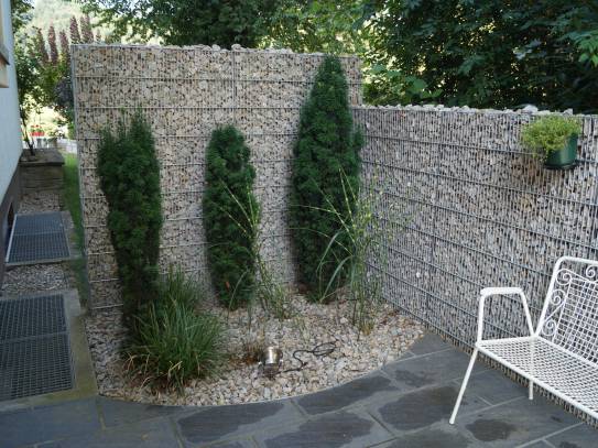Nordbereich- zukünftig als Sommersitzplatz für große Gesellschaften gedacht- vorgefunden wurde ein Komposthaufen, den es zu „verstecken“ galt- weiterhin sollten eine klare Grenzmarkierung und Windschutz gegeben sein. Der Vorschlag, die geplante Gabionenlinie durch grüne Heckenriegel zu unterbrechen, wurde von den Auftraggebern in der Ausstattung der durchgängigen Wand mit Pflanzaccessoires umgesetzt. Die Illuminierung der Gabionen mit Bodenstrahlern macht diese technische Anlage zu einem besonderen Abenderlebnis.