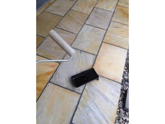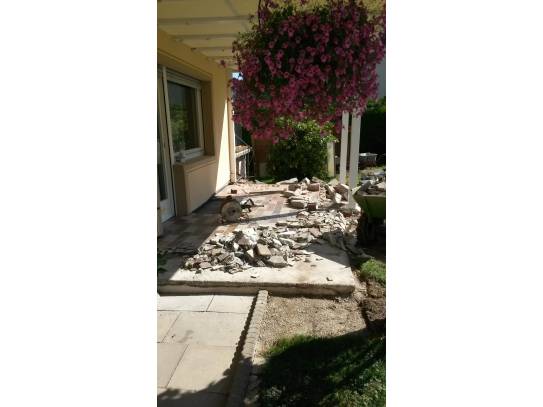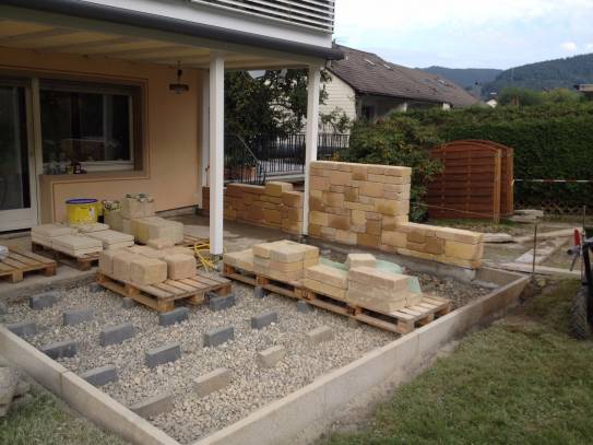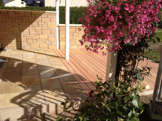Eine Hausgartenterrasse mit brüchigem Klinkerbelag war umzugestalten und zu erweitern - unter einem mit Holzelementen abgestützten Wintergarten im Obergeschoss.