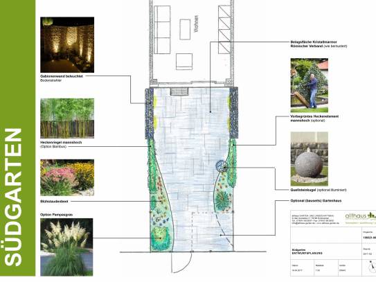 Die Pflanzflächen grenzen nicht wie üblich an die Beläge an, vielmehr sollte die Gesamtgartenfläche auch für Feste nutzbar sein, die Pflanzflächen wurden also aus der dann ebenen, allseitig eingefassten Belagsfläche „herausgeschnitten“.